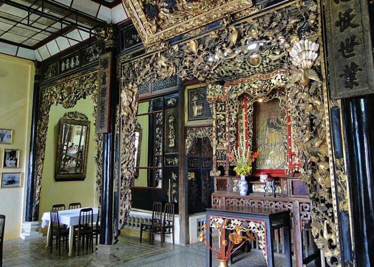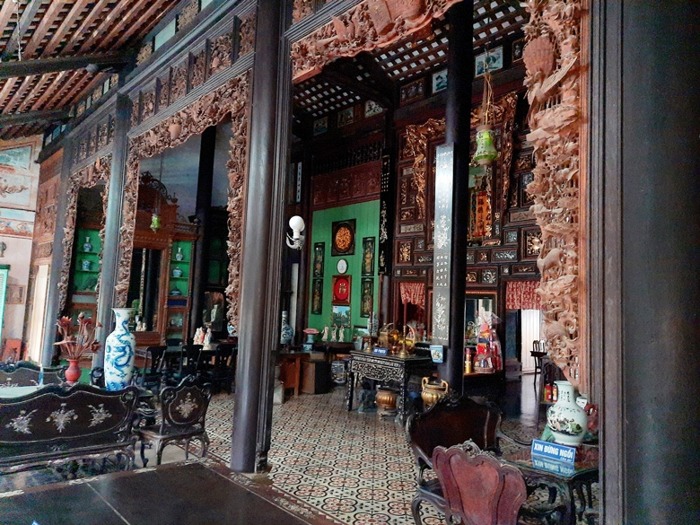 Inside the house there are many beautiful and unique details. The columns are delicately carved, the ceiling is decorated with intricate patterns, and the wall paintings are brightly colored. Wooden tables and chairs, tea cabinets, mahogany cabinets, bronze items, ceramic items… are all kept intact as in the past.
