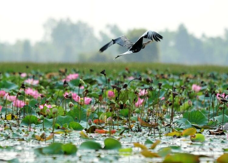 Tan Lap floating village in Long An province is an attractive eco-tourism destination, located in a pristine and peaceful natural setting. With activities such as visiting the Melaleuca forest. You should go to Tan Lap Floating Village during the western floating season from around August to November of the lunar calendar. The floodwaters have returned so animals are also abundant. Going this season, you can see beautiful lotus fields observation tower.